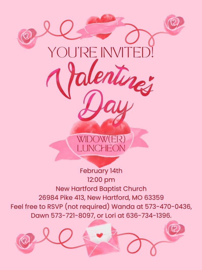 Valentine’s Day Widow & Widower Luncheon– February 14th– 12:00pm– New Hartford Baptist Church