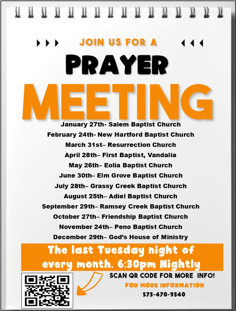 Wednesday Morning Prayer Meetings– 6:30am– Calvin’s Restaurant Eolia, MO
