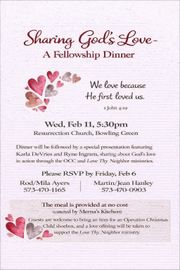 Sharing God’s Love– A Fellowship Dinner– February 11th– 5:30pm– Resurrection Church